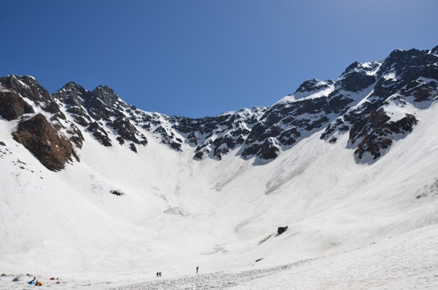 最初は雪が少なくて果たして今年の涸沢は如何なものかと思っていたのですが、こうやって涸沢に到着して見ているといつもの真っ白な涸沢で安心しました。それでも例年に比べると雪は少ないそうですね。