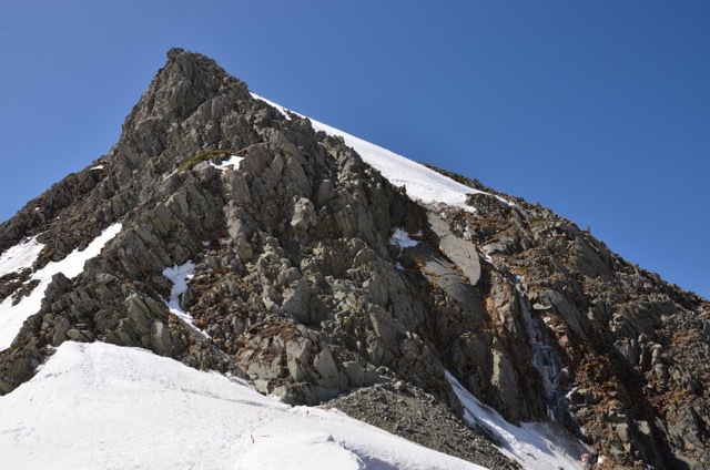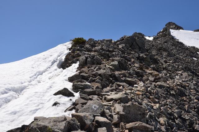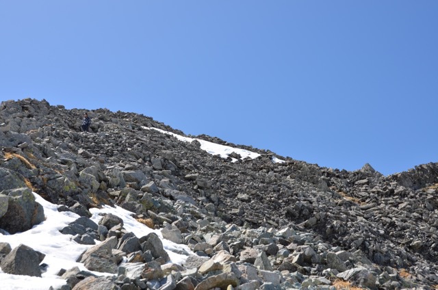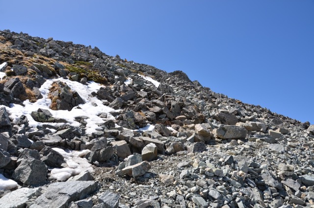 基本的に雪はありません。写真のような岩のルートをアイゼンを付けて進んでいく技術が必要です。アイゼンを外すという選択肢もあるかもしれません。先ほども書きましたがそれはその人の自己判断自己責任です。ある意味今回のような条件の場合、雪渓以外はアイゼンを外した方が正解なのかもしれません。いや、何が正解というのはないのかもしれませんね。
