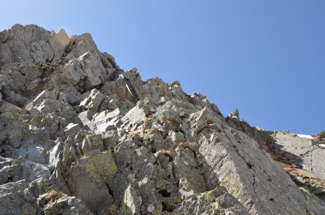 アイゼンを付けて岩の上を歩くと慣れていな場合思わぬところでアイゼンの爪を引っ掛けしてしまい転倒の原因となってしまいます。この稜線で転倒すると即滑落という箇所もありますので、よく念頭に置いておいた方がいいとおもいます。