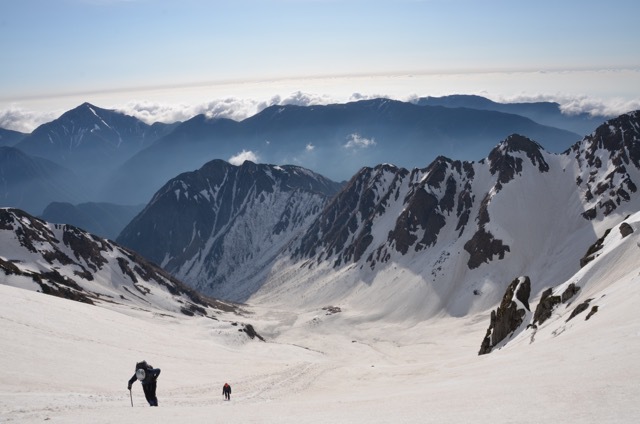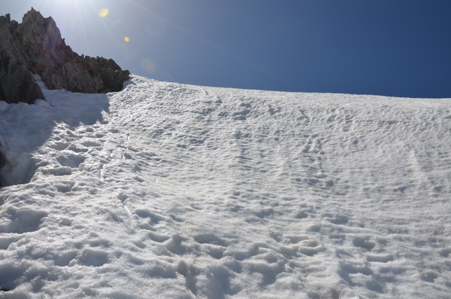最初の岩登りを終えた後に待っているのは写真の雪渓です。