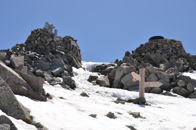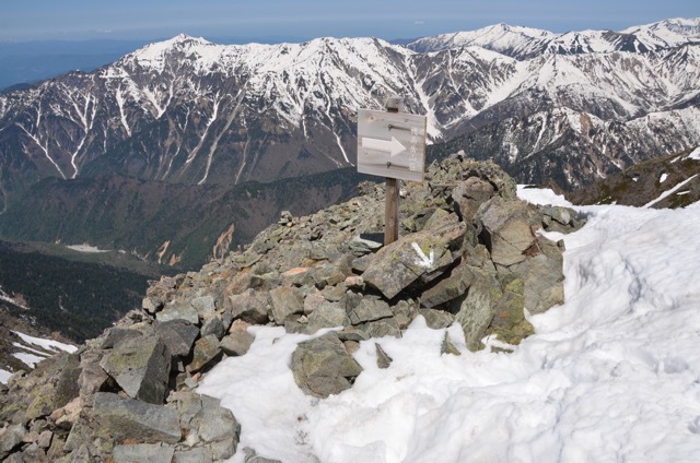途中にジャンダルム(西穂高岳)方面への分岐点があります。もちろんジャンダルムは見るだけです。たとえ夏の時期でも馬の背のナイフリッジを超えていく勇気はありません・・・