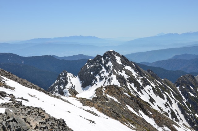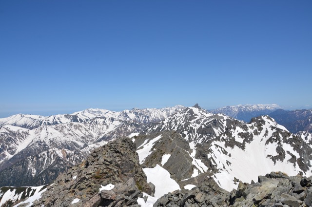 涸沢岳がほぼ同じ目線に見え、北穂高岳が右手に、槍ヶ岳がはるか遠方に見えています。穂高岳山荘から反対側に登る涸沢岳はほぼ雪なしで登れるとのことです。