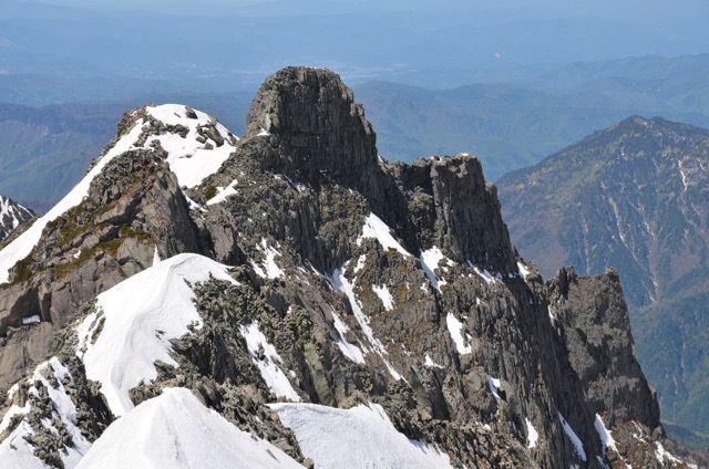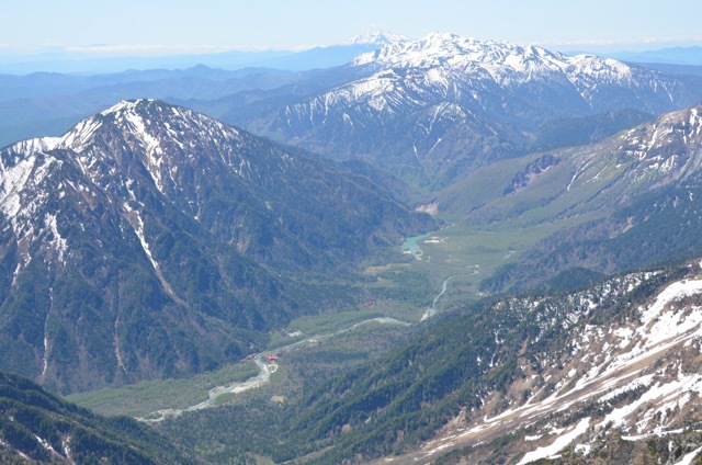 左に霞沢岳、遠くに乗鞍岳そのもっと奥に御嶽山が噴煙を上げているのが見えます(HP用にダウンサイズした画像では見えないかもしれませんが)。