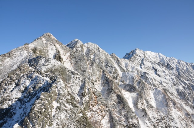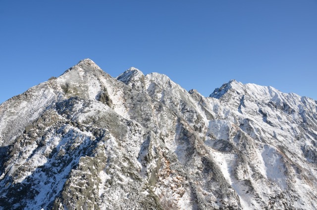 写真で一番大きく見えるのが言わずと知れた西穂高岳独標。その右手前にちょっとした岩峰(第12峰)がありますが、夏ルートと冬ルートはここで合流すると同時にここが最初の難関になります。