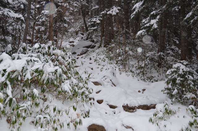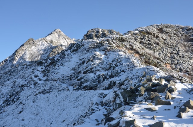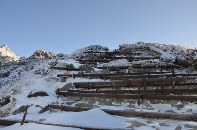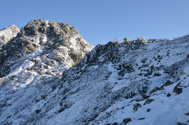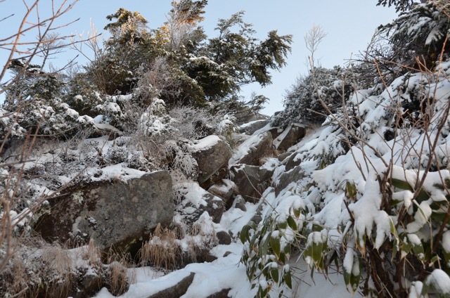 見た感じしっかりと雪が積もっているように見えますが、実際は積もりたてで締まっておらず、雪の層が薄いので、アイゼンの場合は直接岩に刃が当たることになり、慣れていないと苦労します。