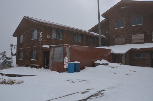 予想していたことですが、視界がなく風も強く吹きつけています。コンディションが良ければ丸山付近まで出てみようかと思ったのですが、これでは稜線に出る意味があまりないので今日はこのまま小屋に入ります。