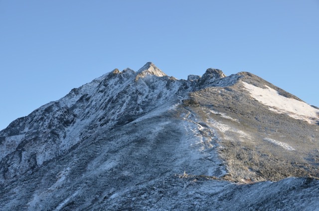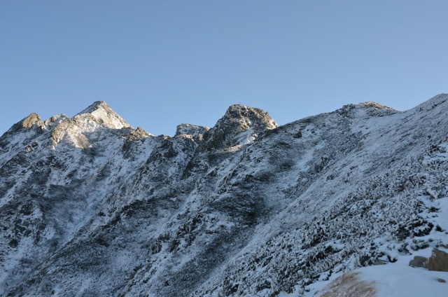 予定日直前までまともな降雪がなく、雪なしの登山になるかと思っていたのですが、2日前に奇跡的な降雪があり西穂の稜線もやっと雪化粧してくれました。