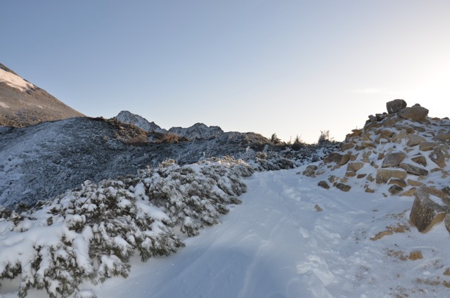 夏道が鮮明に残っていますので、夏道をなぞるように登っていきます。上の方に行くとハイマツの間を登る部分がありますが、積雪期に来るとハイマツの高さを超えて雪が積もっていますので今回はなんだか非常に新鮮な気分でした。