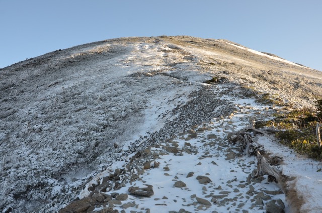 丸山から先の長い登りも雪と岩のミックス状態になっています。
