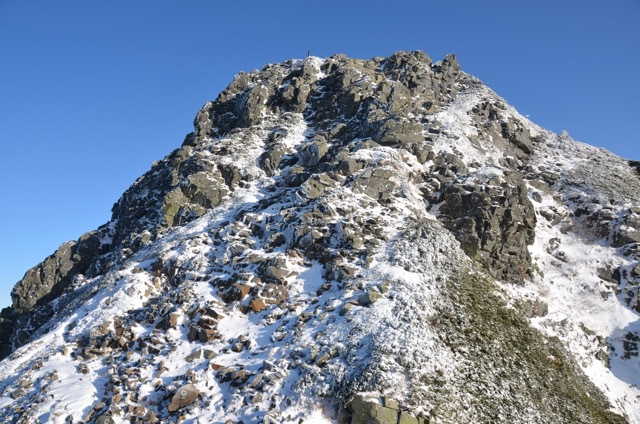 黒い岩肌に白い雪のコントラスト。まさに冬山の穂高らしい光景ですね。昨日登頂した方々のトレースはすべて消えていますが、ここまで来るとルートから外れることは物理的にないので、あとは不用意につまづいて転倒することがないよう気をつけながら進んでいきます。