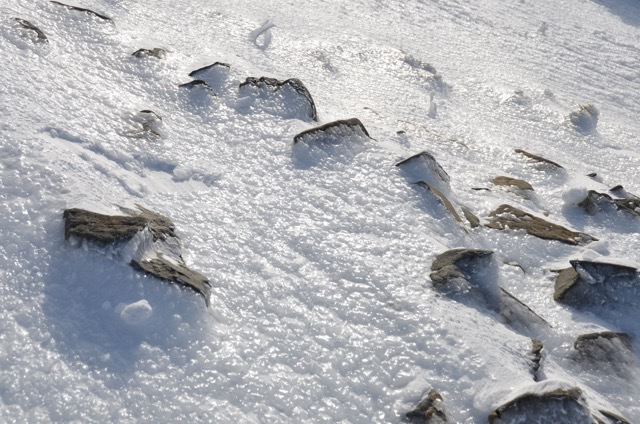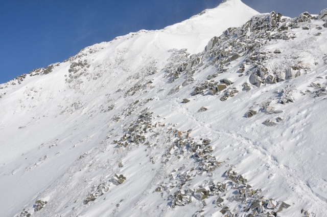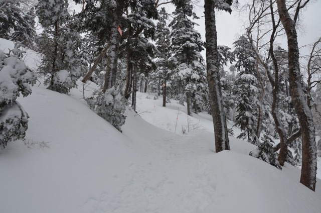 トレースがある部分は思ったよりしまっています。おそらく風が強くて昨晩の雪は飛んでしまったものと思われます。