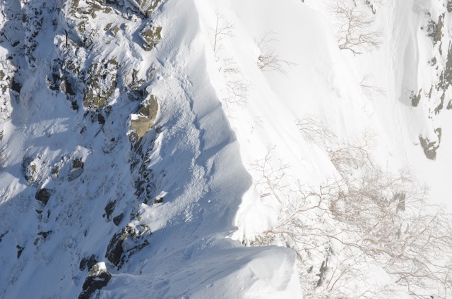 光の加減でわかりづらいですが、トレースがついている部分は雪庇の上です。見ているだけで怖いです。かといっても左側(飛騨側)はご覧のように谷底まで絶壁になっていますので、どうしても右側を歩きたくなるのは解らなくもないです。ですが実は右側(信州側)は完全なる崖になっているんです。つまり、ここで雪庇を踏み抜いたらアウト。