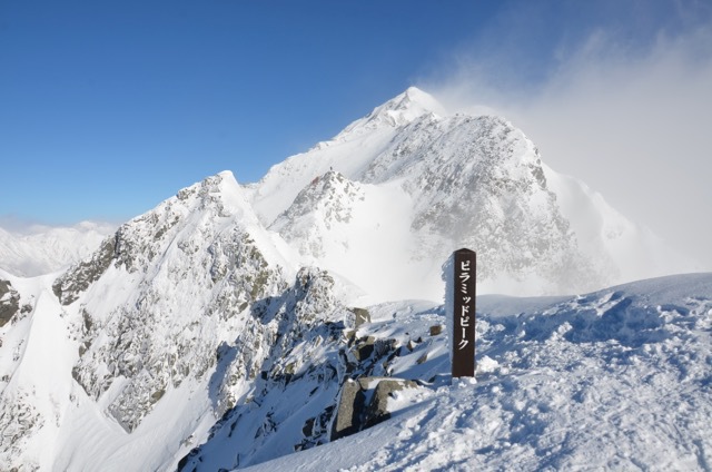 さて、今日は風は強いものの足元のコンディションはそんなに悪くないので、ピラミッドピークまで足を伸ばすことにします。どっちみち下山に時間がかかっていてすぐには降りれないので待っているよりはピラミッドまで行ってきた方が良いだろうということもあり。