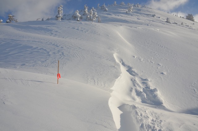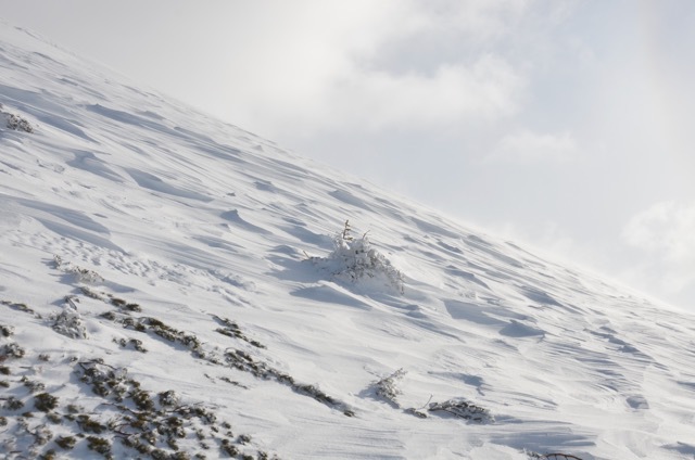 今回は今まであまり見ることのできなかった光景を眺めることができました。なんていうか雪が波打っているようで、海の波を一瞬で凍らせて斜めにしたような感じとでも言いましょうか。