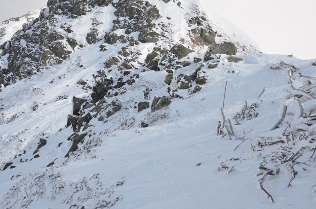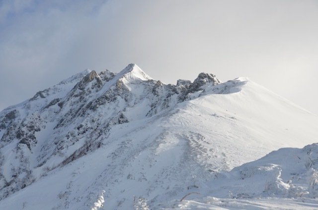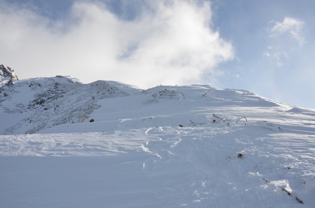 が、鎖から上に来てみると予想が的中しました。本日は雪の状態が悪いです。いわゆる崩れるタイプ。それでもサラサラの雪の下にはしっかりと締まった雪の層があるので、きちんと蹴り込めばアイゼンの前爪で足場を確保することができます。もちろん前爪のないアイゼンでは無理でしょうね。