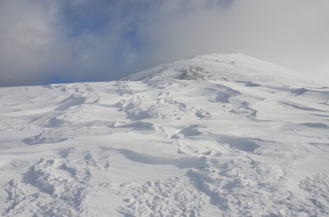 写真には写っていない左の後ろ側は雪が積もって盛り上がっています。吹き溜まるところは積雪し、風が強いとことはあまり着雪せず歩きやすいという状態です。