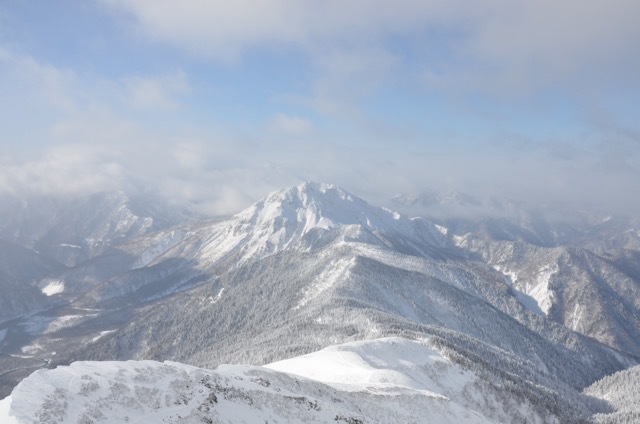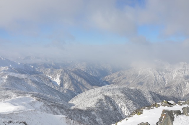 微妙ですが後ろの笠ヶ岳の稜線が見えています。こうやって見ると麓まで真っ白です。記録的な大雪とまではいかなかったもののやはり奥飛騨の界隈はだいぶ降雪したんだなということがわかります。