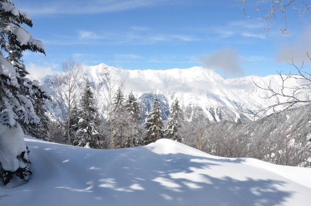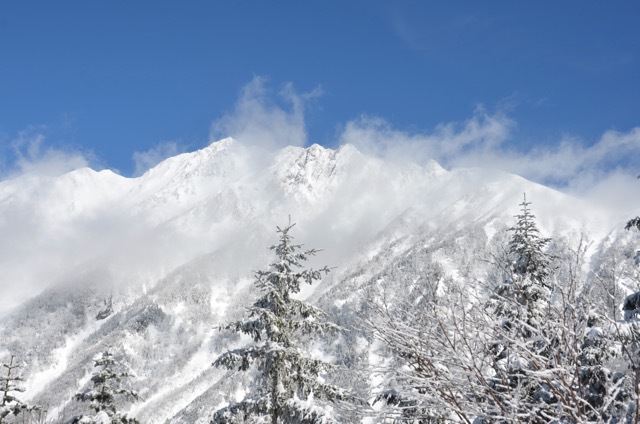 少し雲が出ていますが稜線がよく見えます。やはり白い峰と青い空は絵になります。西穂高岳の稜線もすっかり雪に覆われています。12月ごろはまだ雪が少なく、「今年も雪が少ないのか」と思っていましたが、ここにきてだいぶ積雪量が増えた感じがします。