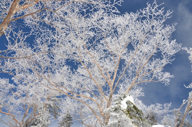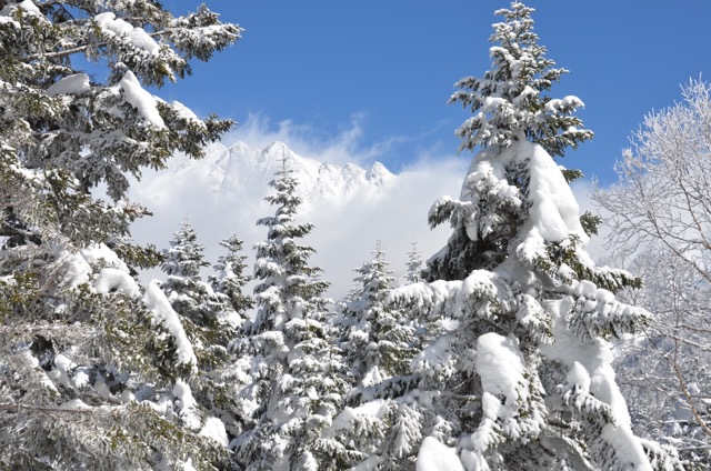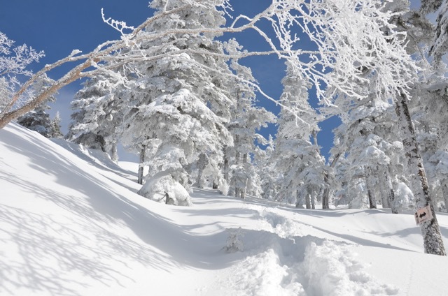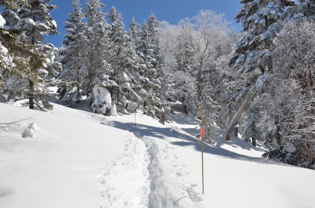 それにしても今日の樹林帯はとても綺麗です。雪をいただいた峰々と青い空というのも美しいですが、こういう白い木々と青空のコラボレーションもまた良いものです。