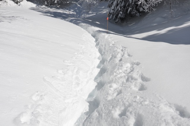 数日前に降った雨の影響で氷の層ができていますが、トレース部分は踏まれているので雪の柔らかい状態になっています。ですが場所によっては氷の層が厚くなっており、アイゼンが刺さらない状態、いわゆるコンクリートの上を歩くような状態の場所があり、これがまた危険な場所でこのような状態になっていました。