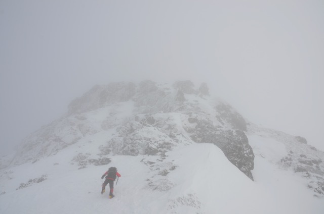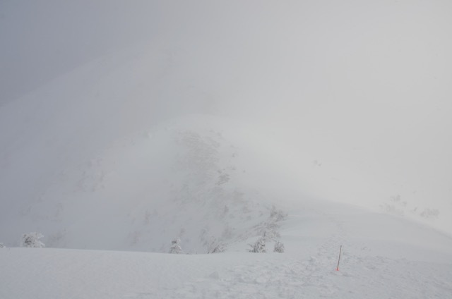 独標手前の第12峰に到達するころにはすっかり雲に覆われてしまい、ほぼ視界がなくなりました。ここまでくるとコースアウトすることは物理的にあり得ないのですが、信州側に張り出した雪庇が通常よりも判別しにくくなるので注意が必要です。