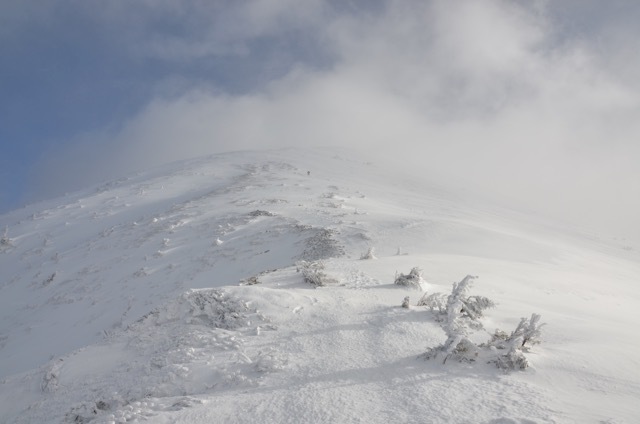 この広大な稜線は急いで登っても疲れるだけなのでゆっくり登っていきます。やはり氷の層ができていてアイゼンで踏み込むとザクッと割れて10センチくらい沈みます。春になるとこのような状態が多いです。