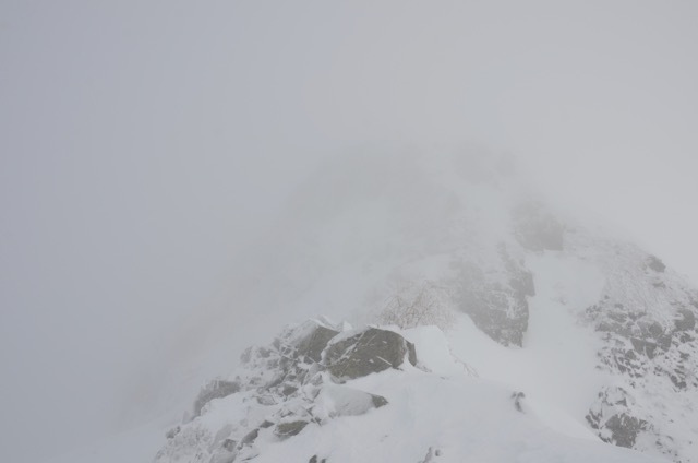 さて、稜線を見上げます。視界がないですが雲が流れているのがわかります。天気予報の通り急速に回復しているものと思われます。