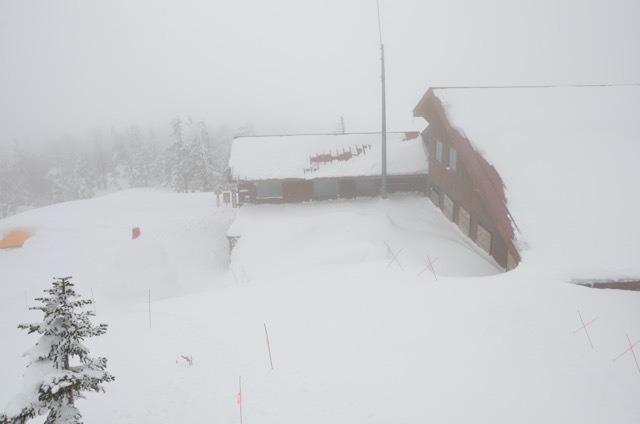 11月とか12月初め頃までは、夏道なので山荘の裏手から近づいていきますが、この時期は山荘の上部から降りて行くような形になります。まさに地形が変わってしまうほどの積雪には圧巻です。