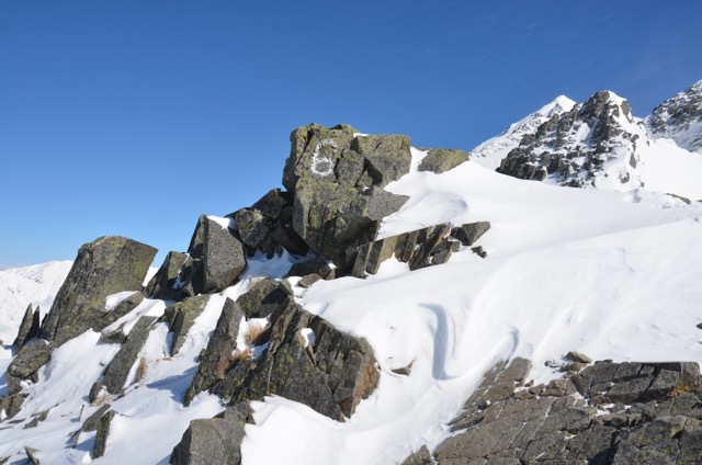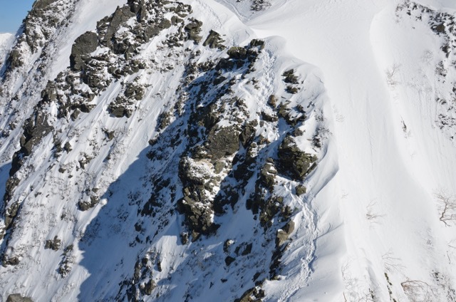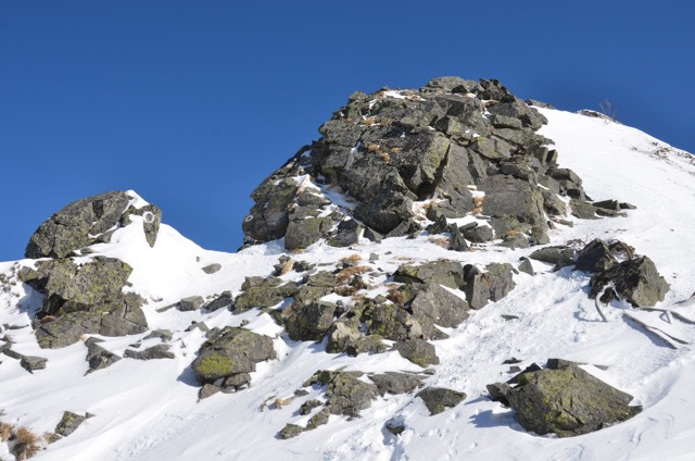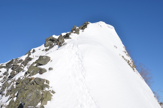 今回はこの第3峰は巻いてくルートにトレースがつけられていました。雪質を考え、トレースがついている方が安全性が高いと判断しましたので今回は巻いていくことにします。足元は積雪しているので岩の上をアイゼンでガリガリさせながら通過するということはありませんが、それでも基本岩場のトラバースとなりますのでかなりの技術が必要です。もちろん高度感も半端ないです。