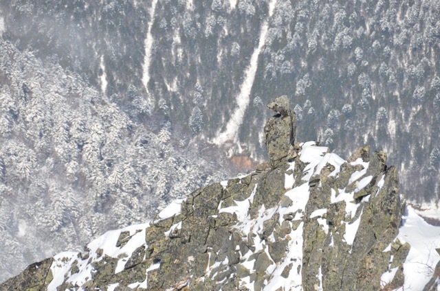 第6峰を超えておりていくと、飛騨側の先端にたぬき岩を見ることができます。信楽焼のたぬきにそっくりなこの岩は、誰かが削って作ったわけでなく本当に自然な形でそびえています。なんだか愛くるしいこのたぬき岩を見ていると元気になってきます。こんな場所によく崩れることなく今までたち続けてきたものだと感心してしまいます。