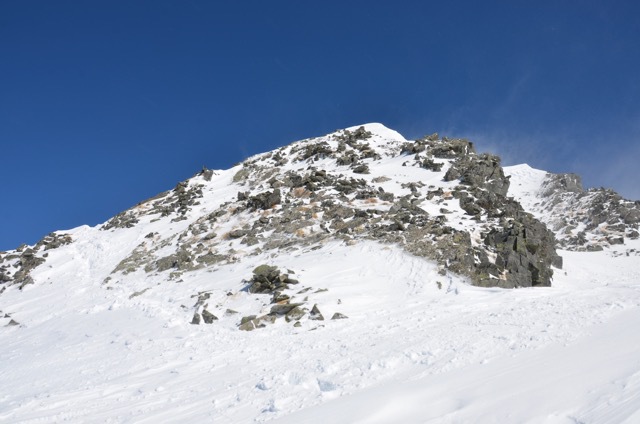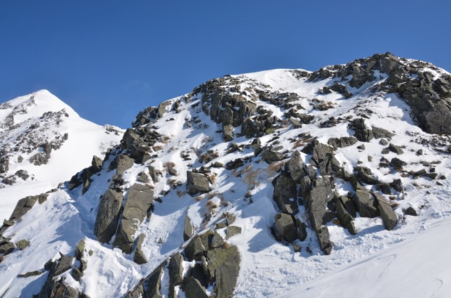 独標を山頂側に降りたコルの部分から次の第10峰を見上げます。写真でも丸印がついていて左から登って行くのだというのがわかります。この10峰も雪のコンディションによってはとても困難な道のりとなります。