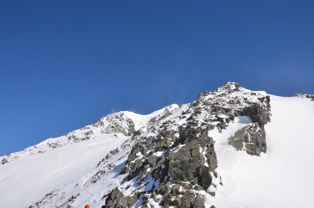 9峰と10峰のコルは痩せ尾根で雪庇が張り出していますし、その先は滑ったら谷底まで行ってしまう場所で、斜度もかなりきつい場所です。クサリも設置されていることから危険な箇所であるということがわかります。ここも、まだ西穂の稜線の経験が少ない頃、新雪のトレースなしの状態で死ぬような思いをした経験があるので、どうしても必要以上に慎重になってしまう部分です。一部岩が落ちたとも聞いていますが、当時と比べると何となく通過が楽になったような気がします。