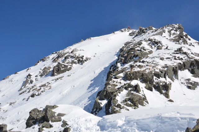 さて、第9峰を越えると大ピークであるピラミッドピーク(第8峰)に向けて登ることになります。ピラミッドピークそのものは高度な技術が求められる場所ではありませんが、写真の雪壁が雪質により困難になる場合があります。