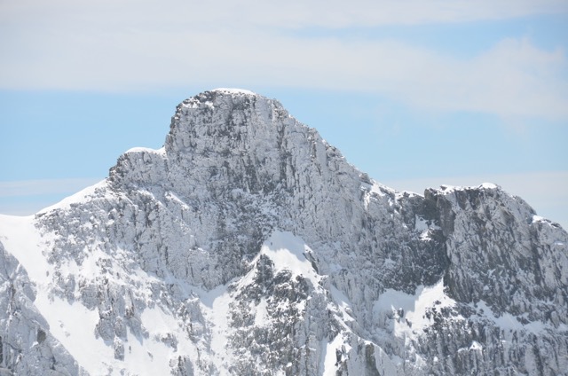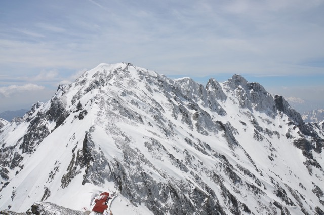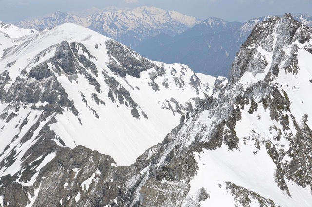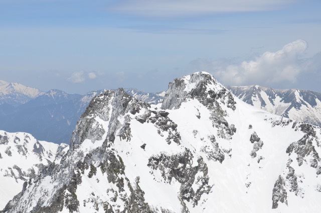 北穂高岳(南峰)と左側は滝谷ドームです。滝谷の切れ落ちた崖の一部分が見えています。滝谷ドームからは夏に縦走する奥壁バンドと呼ばれる難路も見えています。