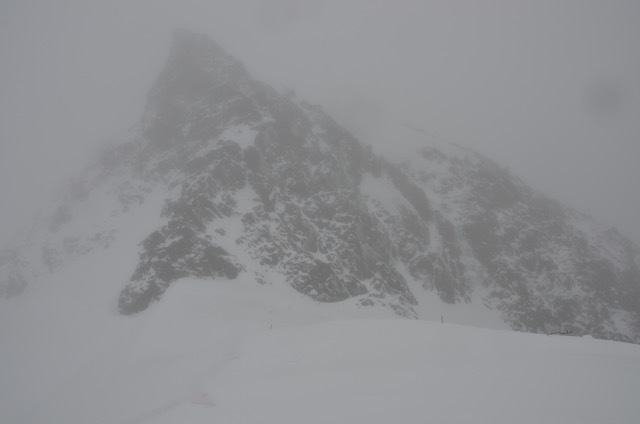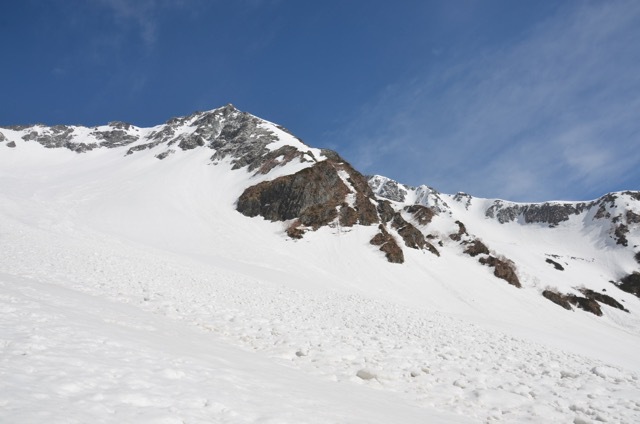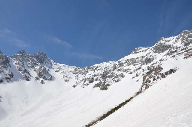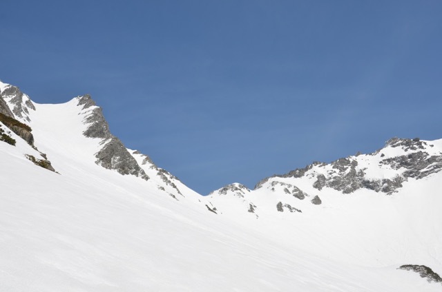 ザイテングラート下部まで登って来ました。この部分は翌日は雪崩ていてデブリと岩の間のわずかな隙間を降りていきました。