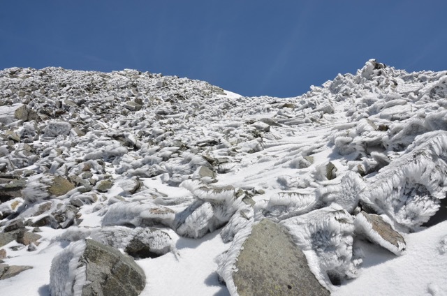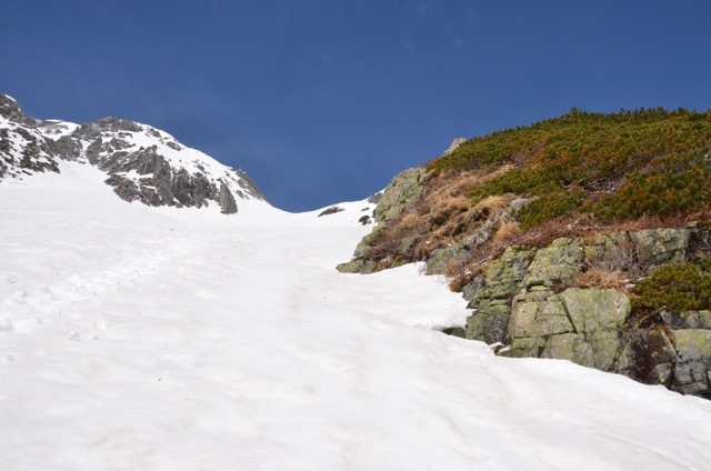 雪渓まで行ってしまえば問題ないですが(雪面が凍結していたらアウト)、そこにいくまでのリスクが非常に高いこと。つまり岩が凍結しているということはホールドできないので3点確保ができないということでもあります。完全なる岩場なのでピッケルで確保するような雪面もありません。気のせいか鎖が若干増えたようにも見えますがそれでもルートの全てに鎖があるわけではありません。