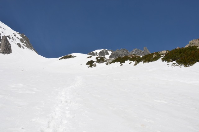 さて、ここでトレースは二手に分かれます。少しわかりづらいかもしれませんが右手のザイテングラート(岩場)を登っていくトレースとそのまま真っ直ぐ登っていくトレースがあります。