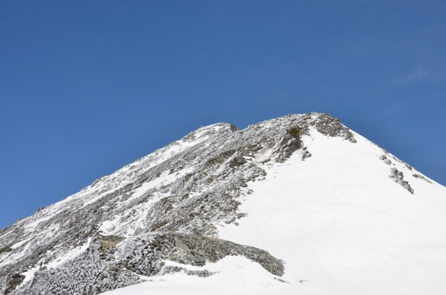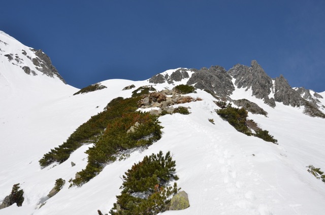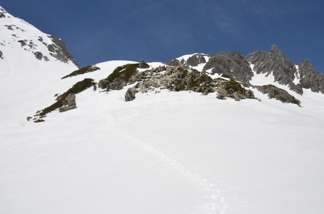 この部分は夏季ルートだと右手に巻きながら岩を登っていきます。今日は3人組の先行パーティーが左右二手に分かれて登っていますが明らかに左側の雪壁から登っている方々は苦戦しているように見受けられますので私は夏季ルートをなぞって岩場を登っていきます。後ほど話を聞くとやはり雪壁が崩れてしまい(ラッセル状態だったと思われる)大変だったとのこと。
