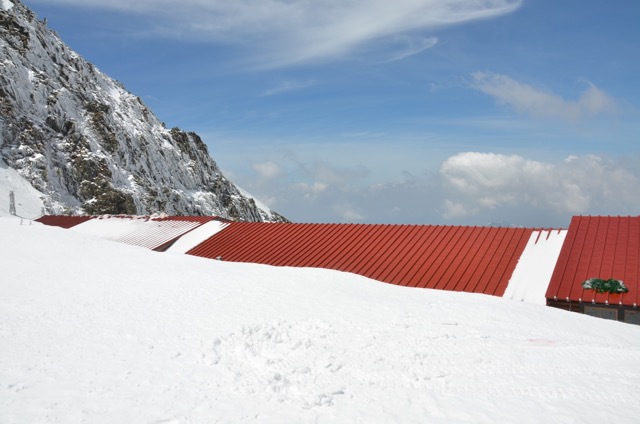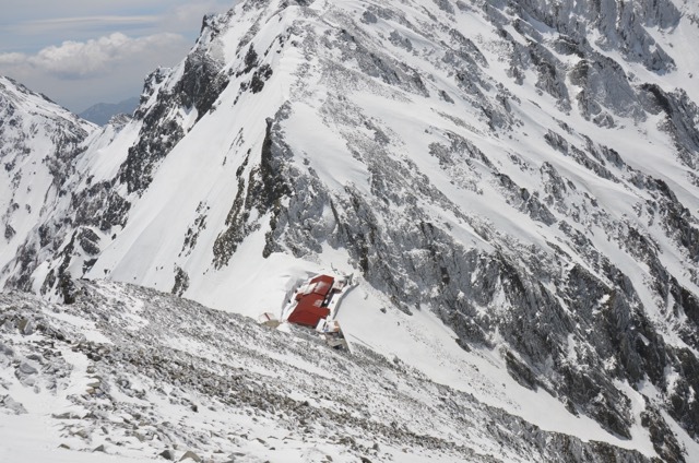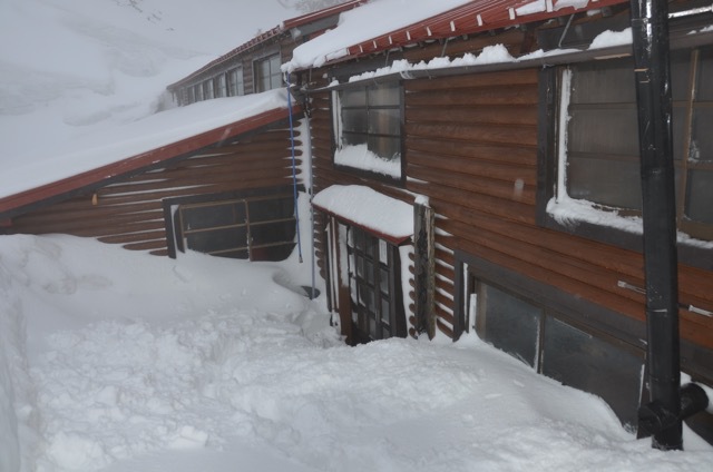 穂高岳山荘もまだまだ雪の中に埋まっているというイメージです。今自分がいるのはちょうど山荘の屋根と同じくらいの高さなのです。しかも穂高岳山荘は2階建。ということはそれだけ積雪しているということです。