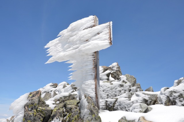 もはや山頂の道標かどうかもわからない姿となっていますがとにかく涸沢岳です。厳冬期の西穂でもこれだけ海老の尻尾が成長するのはあまり見ません。それだけ昨日の吹雪が凄まじかったのでしょうね。