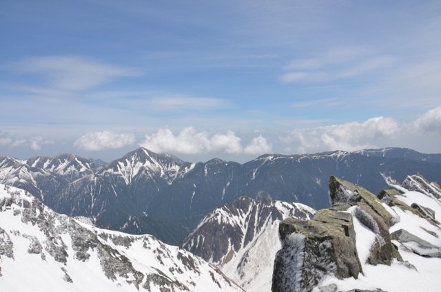 大天井岳〜常念岳〜蝶ヶ岳の稜線が一望できます。こちらの稜線はだいぶ雪が少なくなって来ているようですね。