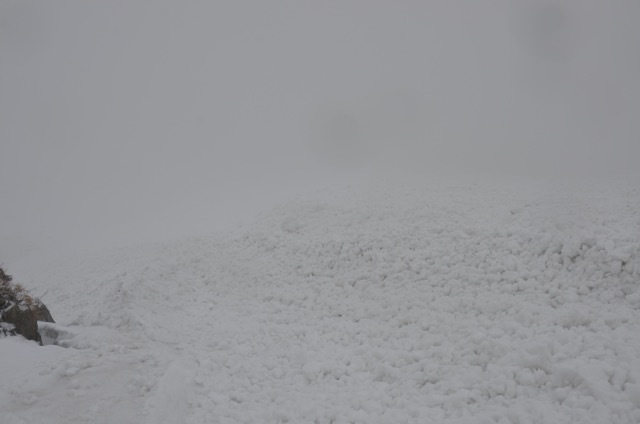 視界に入るのは雪崩後のデブリだけです。写真は一瞬稜線に向けて(上向き)にとった写真に見えますが実際は下に向けて(涸沢方面)とった写真です。そう、気をつけないと自分が今どっちに向けて歩いているかわからなくなってしまいます。