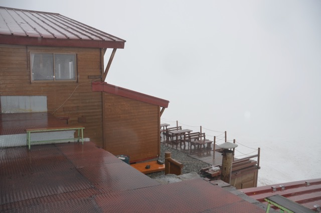 涸沢に近づくと多少は視界が広がりましたがそれでも数十メートル程度でしょうか。涸沢小屋を目標に降りていたのですが、そろそろ着く頃だろうと思っていたにも関わらずいつまでたってもそれらしきものが視界に入って来ません。もしかして小屋を過ぎてさらに下までいってしまったか? と思い少し登り返しました。一瞬視界が回復し、現在位置が把握できました。正しい方向に向かっていることがわかりましたので微調整をして涸沢小屋に向かいます。