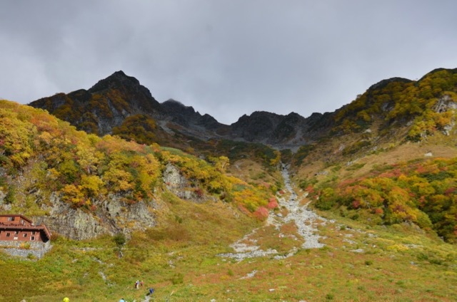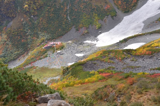 ちょうど涸沢を境に紅葉がピークになっているように見えます。テント場のテントも色とりどりで綺麗なのですが、この時期は紅葉の方がインパクトあるのでテントのカラフルさが一歩引けて見えます。