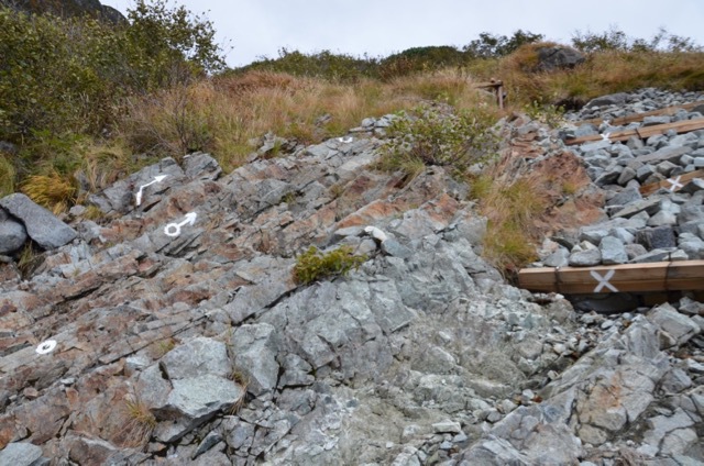 登山道の整備も大変なんだなと思わせられます。写真の箇所も気をぬくと大変なことになるので指示されている通りのルートを登っていきます。