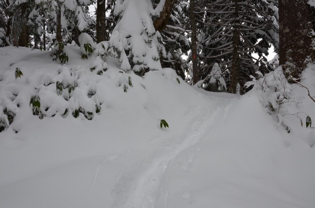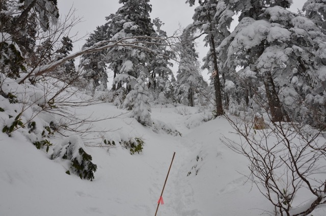 積雪直後は木の枝に雪が積もっていますので注意しないと自分の上に雪がドサドサって落ちて来ます。ザックに木の枝が引っかかりその拍子に首筋に大量の雪が襲いかかる始末。一部は背中の中に入っていき悲しい状態になってしまいました。