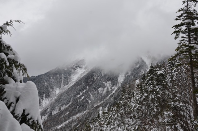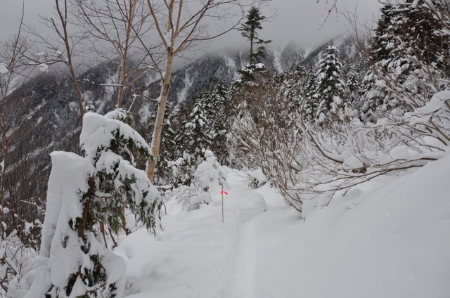 さて、西穂高岳の稜線はこの時点では雲に覆われています。もともと天気が期待できないのは覚悟していましたので「ああ、やっぱりね」という感じで済んでしまいます。これからの時期、計画していた日が好天になるかどうかは、はっきり言って運です。3月にもなれば比較的安定した日が多くなりますが、これからの厳冬期は晴れる日が少ないです。