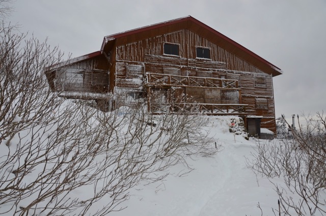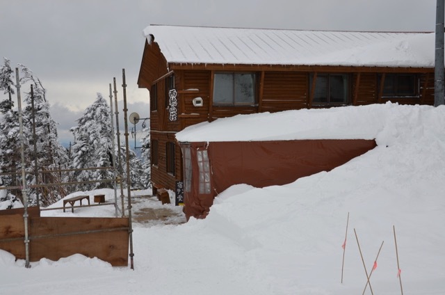山荘裏手の写真の部分は降雪直後は吹き溜まりとなり、胸ぐらいまでのラッセルになります。ごく短い距離ですが運悪く先頭になってしまった場合はこの部分で相当体力を削られます。