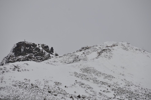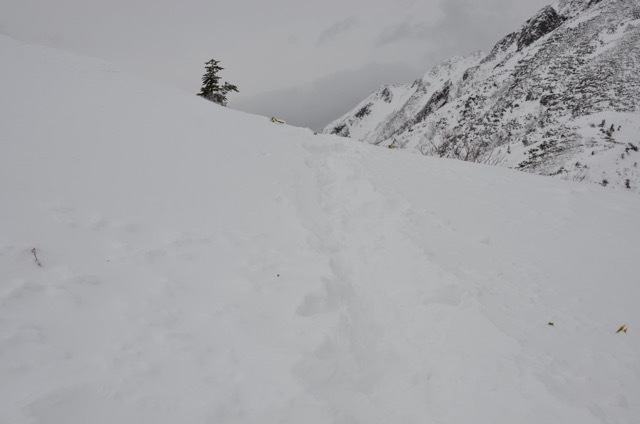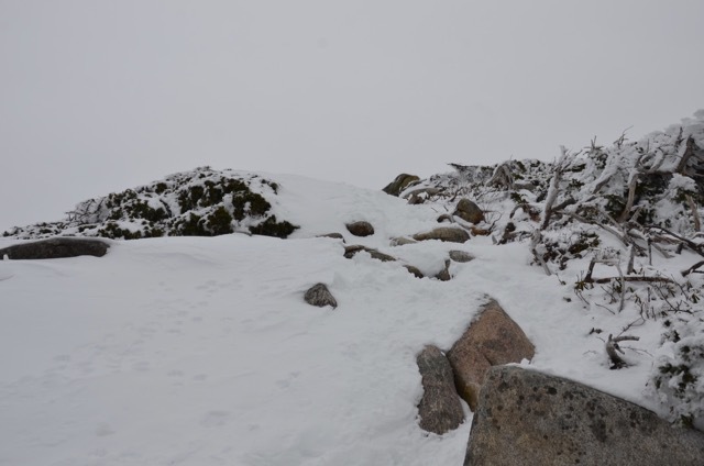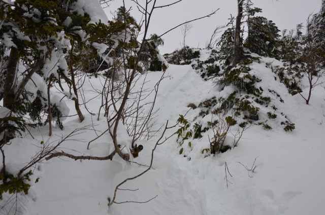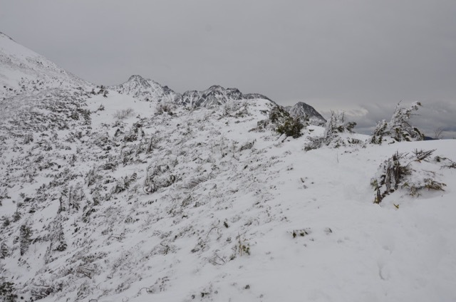 独標の手前、写真でいう一番右側の部分ですが、雪庇が出始めています。ホワイトアウトやそれに近くなると雪庇が判別しずらくなりますので注意が必要です。