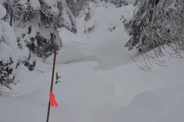 翌日は想定していたよりは落ち着いた感じがありましたが、稜線には出ずに下山のみにします。昨晩は吹雪(麓は雨だったようですが)で、新たに積もった雪により下山は完全にラッセル状態になりました。それでもルートの部分は周囲に比べて若干低くなっているのと、目印の旗が立てられているので、コースアウトの心配はありません。